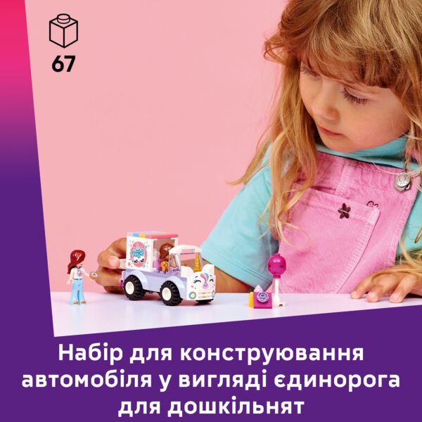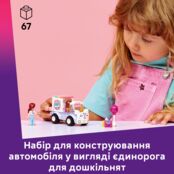Этот игровой набор станет отличным подарком для девочек и мальчиков в возрасте от 4 лет, которые любят строить машинки LEGO Friends с яркой тематикой единорогов. Набор содержит 67 деталей, а также игрушечный автомобиль высотой более 5 см, длиной 9 см и шириной 5 см.