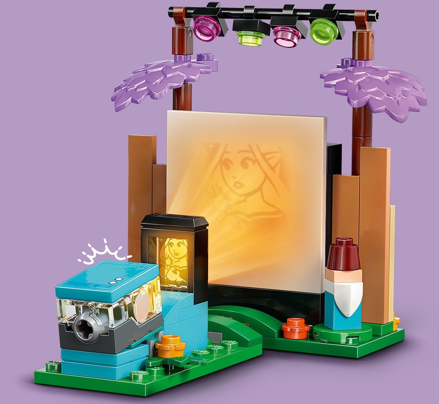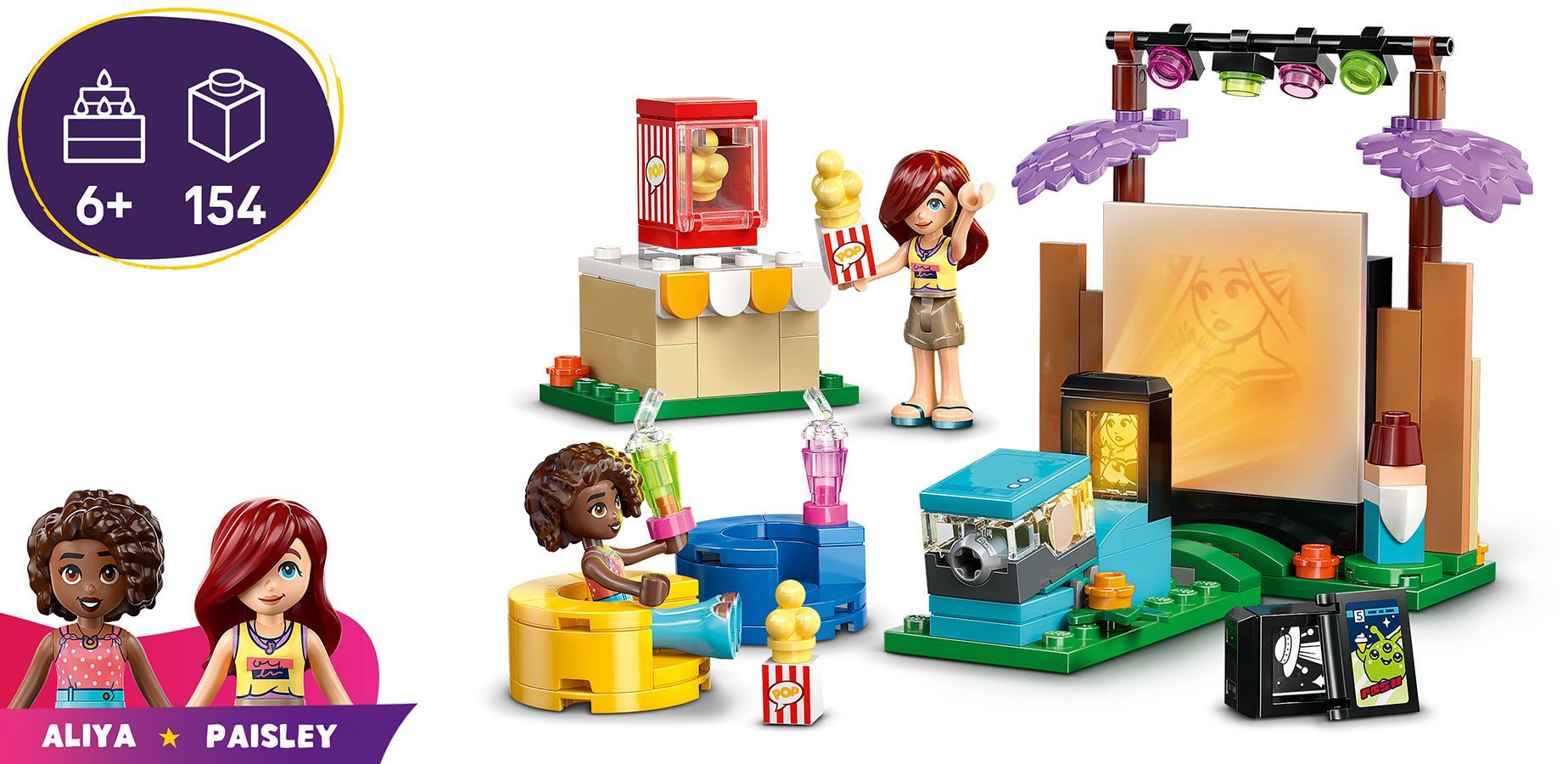 "Свет, камера, дружба!" — дети рассказывают историю подруг Пейсли и Алии, которые наслаждаются киновечером в саду. Вставьте слайд с фильмом в проектор и нажмите на световой кирпичик, чтобы изображение появилось на большом экране. Откройте для себя множество аксессуаров, среди которых машина для попкорна с рычагом, чтобы попкорн «лопался»! Другие аксессуары включают коробку для попкорна, напитки, комикс и 2 удобных кресла.