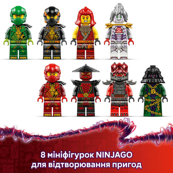 Этот боевой игровой набор содержит 8 минифигурок персонажей серии NINJAGO, с которыми поклонники ниндзя могут разыгрывать насыщенные приключения. В наборе вы встретите воинов-ниндзя Ллойда, Коула, Вайлдфаера и Кая, а также их союзника Пиксала, каждый из которых имеет оружие ниндзя, а также злодеев: Дрикса, Заркта и Воина-дракона с их собственным оружием.