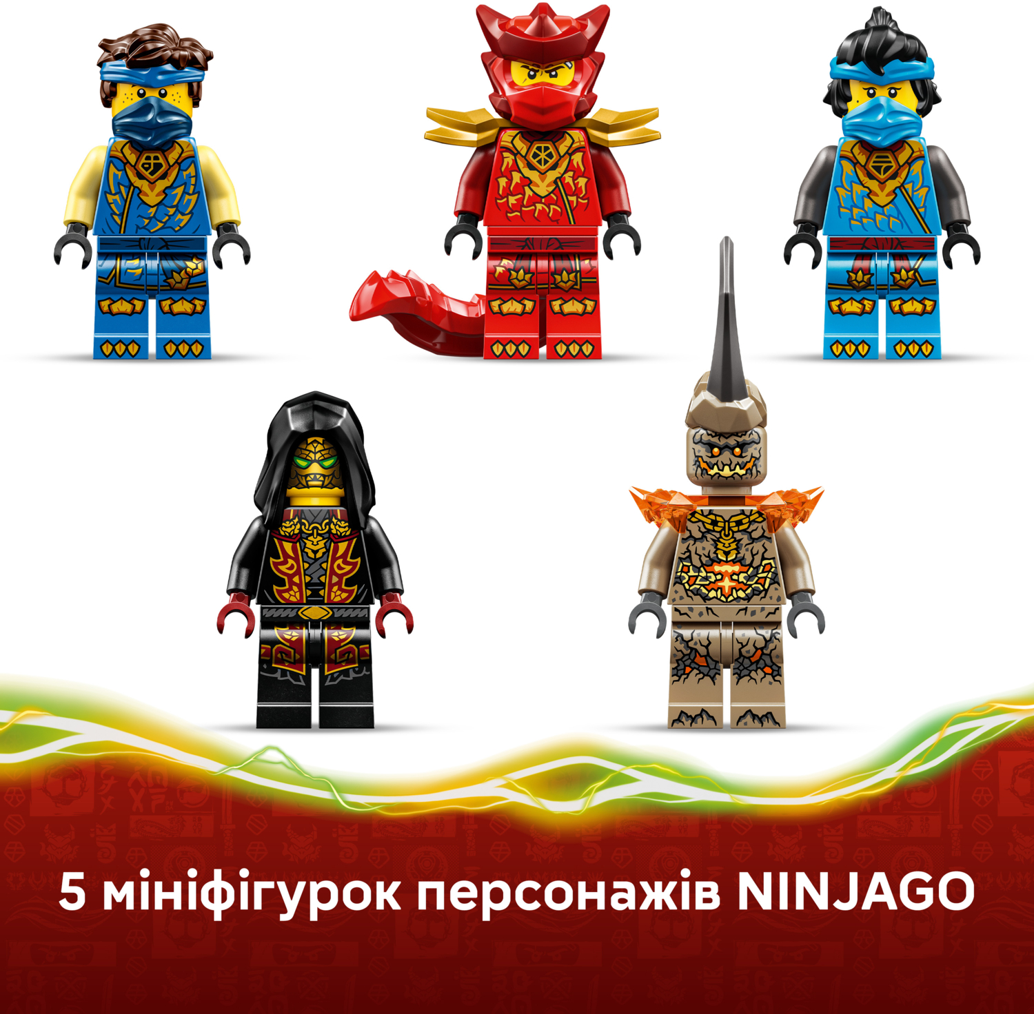 Набор содержит 5 минифигурок Ninjago: Джея, Нию и Кая в виде дракона, а также злодеев Земного монстра и Лоялиста-лидера, участвующих в битвах добра против зла.