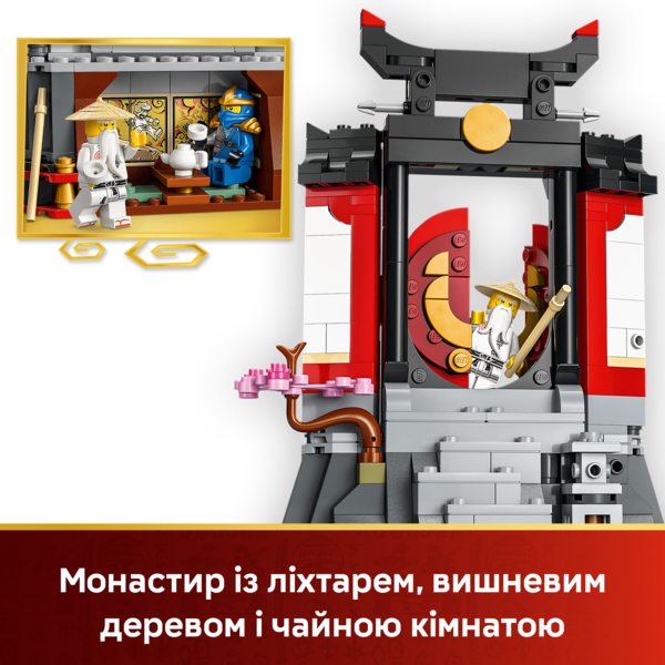Эффектный игрушечный монастырь ниндзя оснащен лестницей, открывающимися воротами, каменным фонарем и цветущей вишней, а с тыльной стороны расположена чайная комната с наклейками, которые воспроизводят легендарную битву из мира Ninjago. Набор содержит персонажей из 1 сезона сериала LEGO Ninjago: Кай, Зейн, Коул, Джей, Ллойд, Ву, Самурай X и коллекционная минифигурка Мастера молнии на отдельной подставке, которую можно присоединить к монастырю.