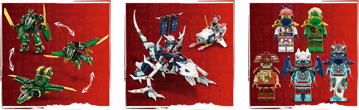 Дети могут создать игрушечный мех, который имеет подвижные ноги и руки, а также кабину и 2 большие аксессуары с мечами. Затем они могут переставлять детали, чтобы создать супер крутой реактивный самолет с кабиной, крыльями и реактивными двигателями. Этот приключенческий игрушечный боевой набор содержит 5 мини фигурок: Сора и Ллойд, вооруженные аксессуарами для оружия ниндзя, чтобы сражаться со злодейской троицей Кура, Тира и Спектрального воина дракона, у которых есть баннер с тайным посланием, его можно прочитать только с помощью полупрозрачного раскрывающегося лезвия Ллойда. У Сора есть летающий игрушечный мотоцикл, а у злодеев - игрушечный призрачный дракон.