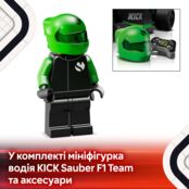 Модель болида F1 имеет кокпит, открывающийся при поднятии планки системы гало, заднее крыло, подвеску на поперечных рычагах, спонсорские наклейки и шины с надписью Pirelli. Болид Формулы 1 также содержит минифигурку водителя в костюме и шлеме KICK Sauber, которую можно разместить в кабине.
