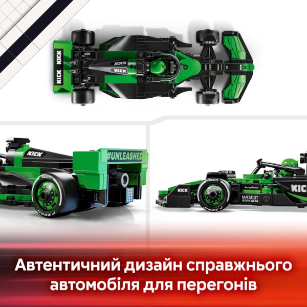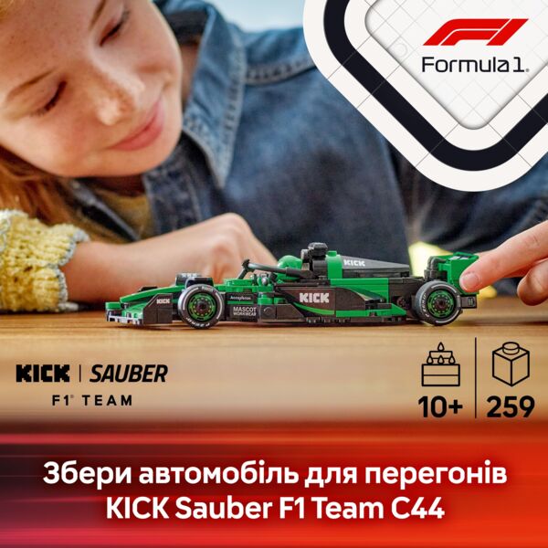 - Детский болид F1 KICK Sauber - дети от 10 лет могут собрать набор с болидом LEGO Speed Champions F1 KICK Sauber Team C44, принять участие в гонках и поставить его на полку.