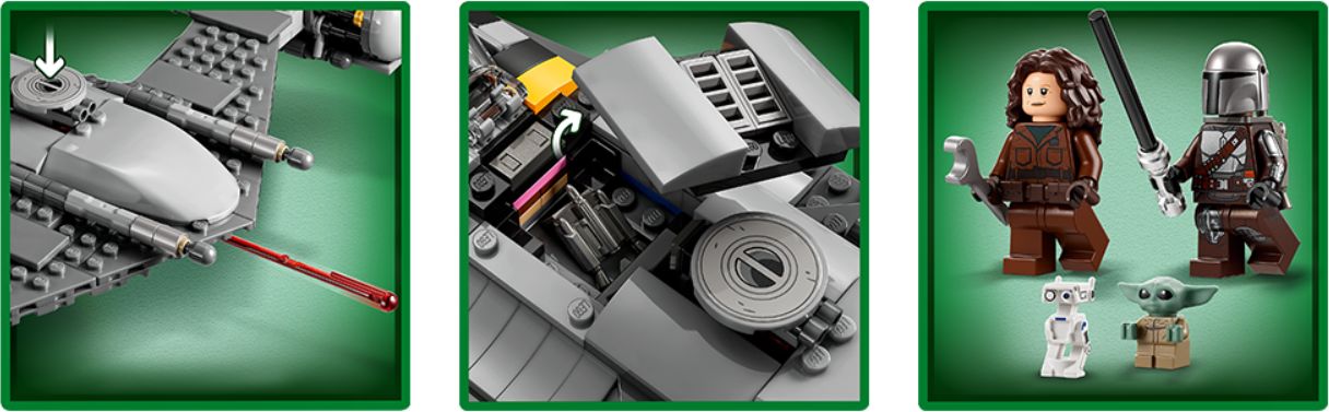 У звёздного истребителя есть кабина для минифигурки, пассажирское место для Грогу, грузовой отсек, пружинный стрелок и реалистичные детали. А также набор включает в себя минифигурки LEGO Мандалориана, Пели Моттои и Грогу (которого фанаты ласково называют «малыш Йода»), дроида BD, чтобы вдохновить на творческую ролевую игру.