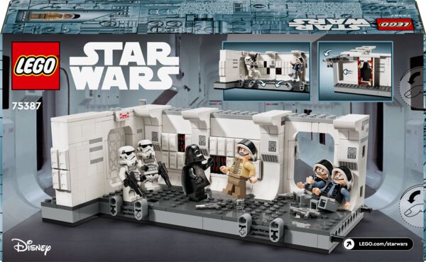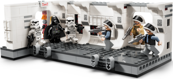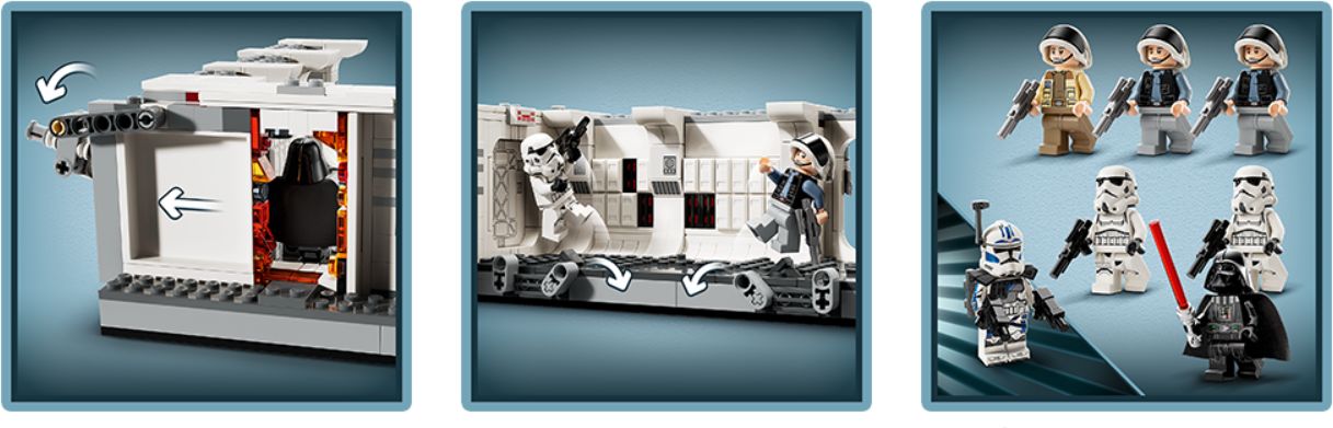 Фантастический игровой набор с забавными функциями - нажимайте на рычаги, чтобы «взорвать» входную дверь в коридор, и опрокидывайте минифигурки LEGO во время сражений. В наборке также есть 7 минифигурок - Дарт Вейдер, 2 штурмовика, 2 десантника Повстанческого флота и капитан Антиллес, а также юбилейная минифигурка LEGO Star Wars 25-й годовщины подставкой для демонстрации.