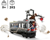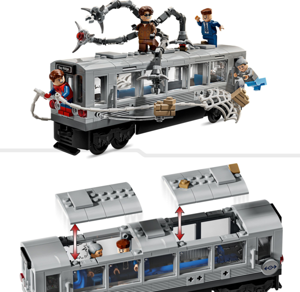 Этот набор для строительства поезда метро Super Hero основан на культовой сцене из фильма Marvel Studios «Человек-паук 2». В комплект входят 4 минифигурки: Дж. Джона Джеймсон, тетя Мэй, Человек-паук и Док Оск. У минифигурки Человека-паука есть сменные головы - в маске и без маски - и большая паутина, которую можно прикрепить к поезду. У минифигурки Дока Оска 4 шарнирных щупальца, 2 с элементами «лазерного луча» и 2 с зажимами, которые крепятся к поезду.