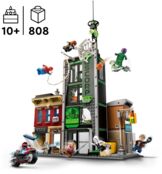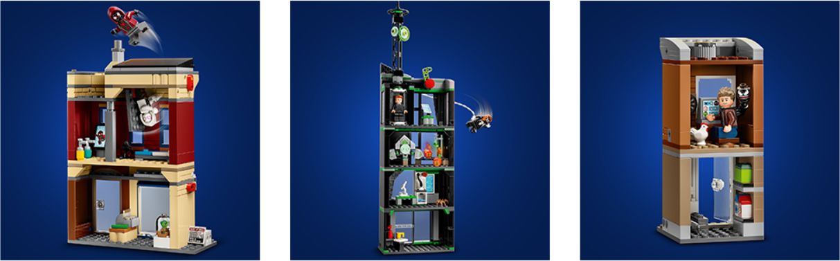 Уличная сцена состоит из 3 отдельных зданий: Квартира Майлза Моралеса с ювелирным магазином под ней, здание Оскорпа и квартира Венома с газетным киоском внизу. Каждая комната обставлена соответствующим оборудованием и аксессуарами. 8 минифигурок LEGO из фильмов Marvel обеспечат бесконечную борьбу с паутиной: Человек-паук, Женщина-паук, Майлз Моралес с мотоциклом, Эдди Брок, Паук-призрак, Норман Озборн, Охотник Кравен и Зеленый Гоблин со своим планером. Прозрачные палочки позволяют детям с реалистичной легкостью позиционировать и придавать позы персонажам.