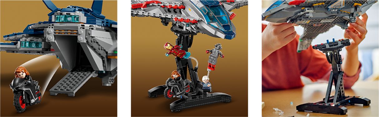 Модель Квинджета, которую можно сложить, содержит 5 минифигурок: Черная Вдова с мотоциклом, Железный Человек, Квиксилвер, Ультра Альтрон и Соколиный Глаз с луком и стрелами. Минифигурки можно прикрепить к различным местам на самолете.