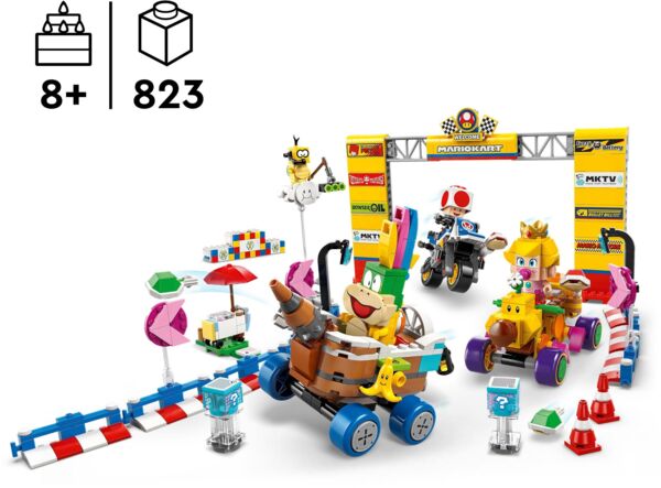 На старт, внимание, к конструированию! Позвольте детям создавать собственные трассы и транспортные средства Mario Kart, мчаться к победе и играть в роли культовых персонажей с набором LEGO Super Mario: Mario Kart: Baby Peach & Grand Prix. Отличная идея подарочного набора Nintendo для мальчиков, девочек и геймеров в возрасте от 8 лет включает в себя транспортные средства Wild Wiggler, Landship и Standard Bike, которые могут запускать снаряды, а также стартовые ворота, шлагбаумы на трассе, дорожные конусы, пьедестал победителей, вагон со сладостями и Lakitu's cloud.