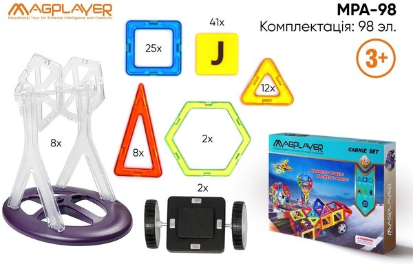 Набор "Карни" состоит из 98 элементов. С ним легко создать что угодно: автомобили, болиды, летучие корабли, кораблики, животных, роботов, здания и тому подобное. Магнитные конструкторы Magplayer предназначены для создания невероятных трехмерных пространственных форм. Отлично развивают логику, воображение, фантазию, конструкторские способности, трехмерное видение. Очень тактильные, их приятно брать в руки и играть. Играя, ребенок развивает мелкую моторику, речь, учит геометрические фигуры. Яркие цвета также привлекают своим разнообразием. Изготовленны из качественной высокопрочной пластмассы, которая защищает тело магнита. Соединив детали, получим сооружение, которое будет прочно держаться и радовать маленького художника. Состоят такие конструкторы из простых геометрических форм: квадрат, треугольник, ромб, трапеция, соединительные элементы. Также есть различные вставки с различными значениями и буквами.