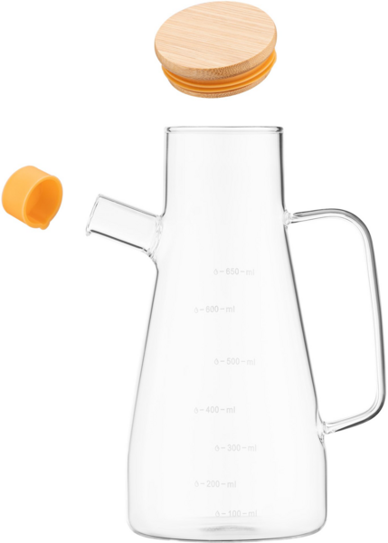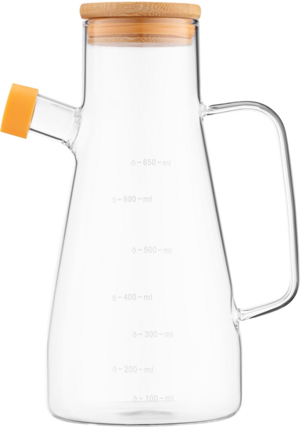 Изготовленная из качественного боросиликатного стекла, за исключением бамбуковой крышки, бутылка не только станет настоящим украшением стола, но и надежным помощником в кулинарных экспериментах. При высоте (без крышки) 21 см и диаметре 9,2 см объем сосуда составляет 650 мл. Термостойкость от -20 до +150 °C обуславливает возможность использовать бутылку во время разнообразных кулинарных процессов. Допустимо мытье в посудомоечной машине.