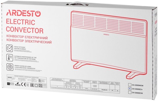 Ardesto CH-2000ECA использует надежные комплектующие – закрытый оребренный нагревательный элемент немецкой компании Eihenauer, а также итальянский высокоточный биметаллический термостат. Отсутствие движущихся компонентов и продуманная конструкция полностью исключает любые шумы при работе. Конвекторы Ardesto серии ECW оснащены недельным программатором с LED-дисплеем, пятью предустановленными программами и тремя программами для ручной настройки. Точность поддержки температуры на высоком уровне – 0,1°C, а шаг регулировки составляет 0,5°C. Базовые режимы — «Комфорт» и «Эконом». Также предусмотрен таймер, контроль открытого окна и блокировка клавиш.