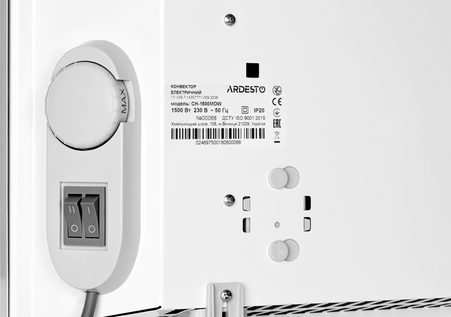 Ardesto CH-1500MOW использует надежные комплектующие - открытый игольчатый нагревательный элемент немецкой компании Eihenauer, а также итальянский высокоточный биметаллический термостат. Отсутствие подвижных компонентов и продуманная конструкция полностью исключает любые шумы при работе. Механическое управление состоит из двух клавиш включения, отвечающих за уровни мощности, а также поворотного регулятора.