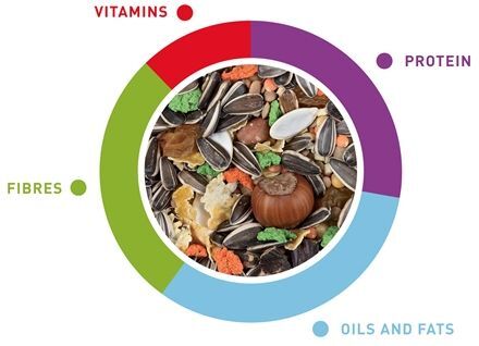 | Состав | Семена (арахис 1,5%), злаки, овощи 8%, фрукты 5% (виноград 1,5%, яблоко 0,5%), орехи (фундук 1%), красители |