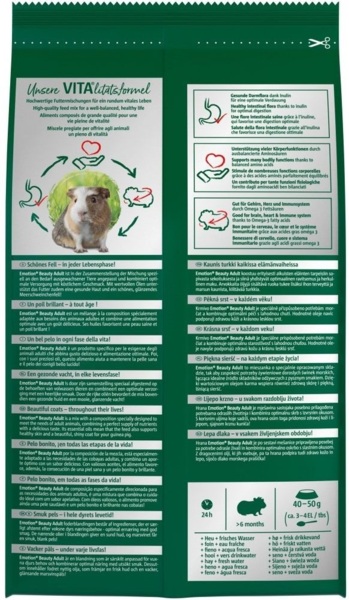 Корм для морских свинок Vitakraft Emotion. Сочная свёкла, богатая клетчаткой люцерна, ароматная петрушка - здесь собрано все самое вкусное и полезное для морских свинок. Состав корма подобран специально для морских свинок и содержит метионин для роста шерсти. Полезные масла поспособствуют блеску шерсти и здоровью кожи. Без добавления сахара, искусственных красителей и консервантов. Вкусная и питательная смесь в упаковке, сохраняющей аромат и свежесть корма.