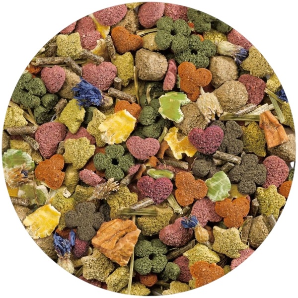 | Состав | Люцерна - 12,8%, зерно, овощи (свекла сушеная - 1,1%), фрукты, петрушка сушеная - 2%, инулин - 1,9%, семена, масла и жиры -1,1%, васильки, минералы, морские водоросли, экстракт юкки Шидигера, ДГК 0,06%, сырая клетчатка 14,5% |