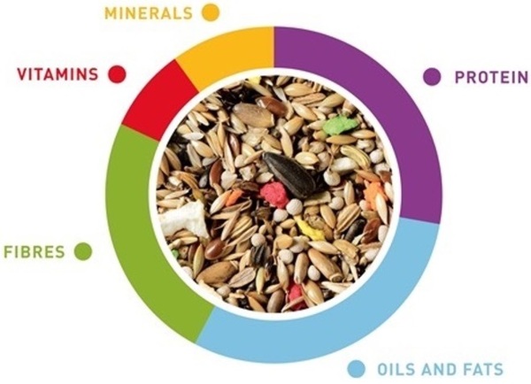 | Состав | Семена (расторопша 10%), минералы (крошка раковины 3%), хлебобулочные изделия (бисквиты 2,5%), фрукты (яблоко 1%) |