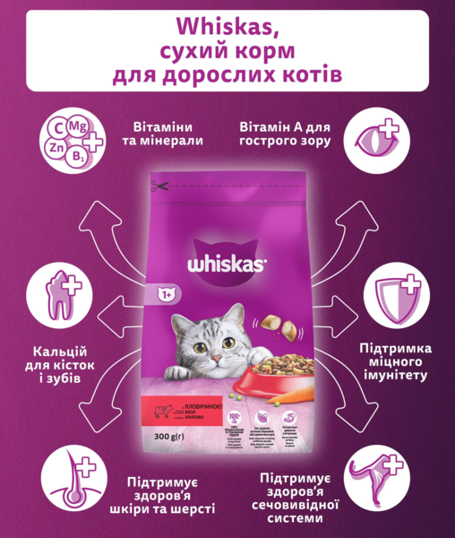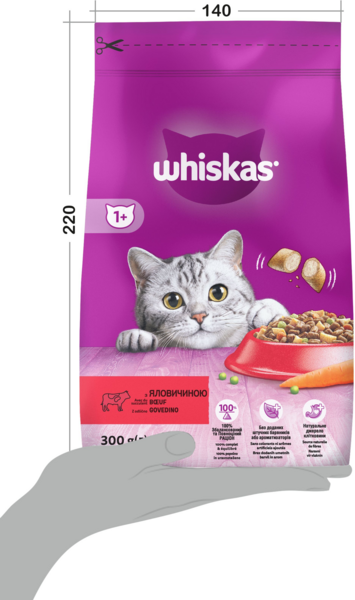 - Сухой корм для взрослых котов с говядиной Whiskas 300г