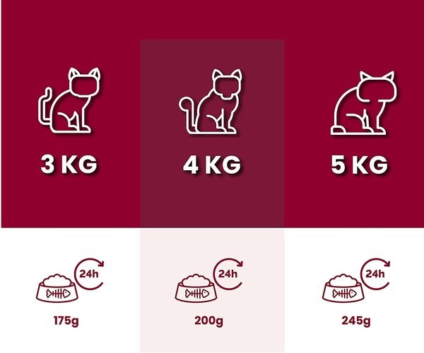 Суточная порция для кота весом 3 кг составляет 175 г корма. Если любимец весит 4 кг, рекомендуемое количество - 200 г, если он весит 5 кг, то порцию следует увеличить до 245 г.