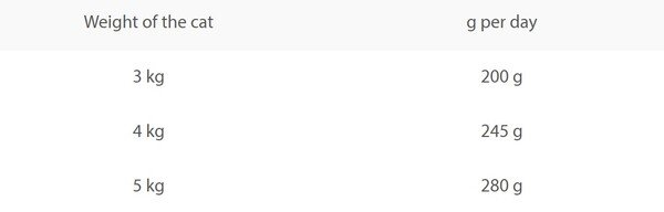 - коту с весом 5 кг можно давать 280 г корма.