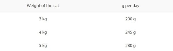- Для кошек с весом 3 кг - 200 г корма в день;