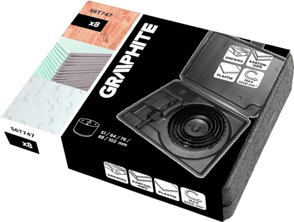 Набор коронок Graphite - удобный комплект для быстрого вырезания больших отверстий в древесине и древесных плитных материалах. Подойдет для столярных и монтажных работ: установки фурнитуры, протягивания кабелей, подготовки технологических отверстий в фанере, ДСП или МДФ. Благодаря подборке популярных диаметров легко подобрать оптимальный размер под конкретную задачу и получить аккуратный результат без лишних подборов оснастки. В комплекте - коронки популярных диаметров и адаптер для установки в дрель, а кейс помогает удобно хранить и транспортировать набор.