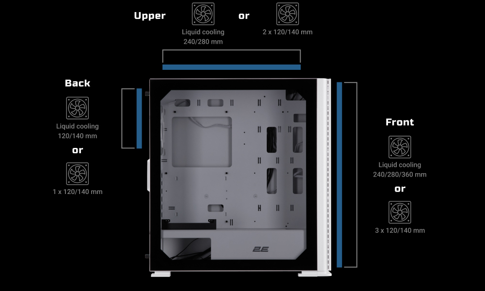 Встроены 4 шт. ARGB вентиляторы: 3 × 140 мм на передней панели и 1 × 120 мм на задней панели. Подключение: 6pin. Возможно установить 6 × 120 мм или 140 мм вентиляторов.