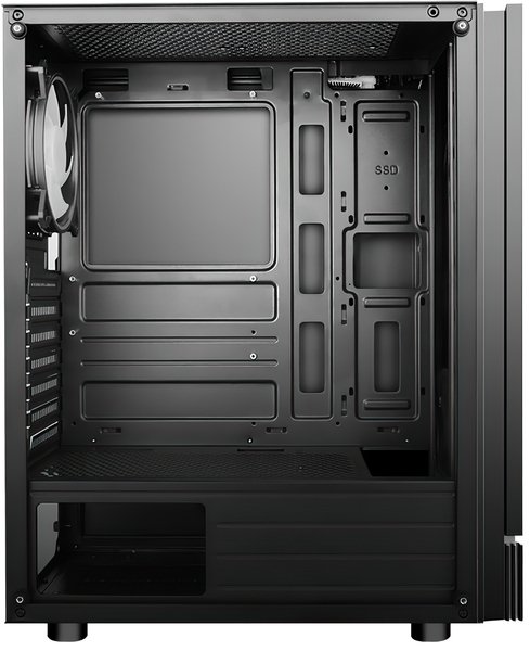 Материал корпуса - сталь 0.5 мм, боковая панель из 5мм закаленного стекла. Типоразмер корпуса Mid Tower — это совместимость с материнскими платами ATX, Micro ATX, Mini ITX. Корпус без блока питания. Пользователю предоставляется возможность самостоятельного выбора источника питания, в зависимости от уровня системы, который устанавливается в нижней части корпуса.