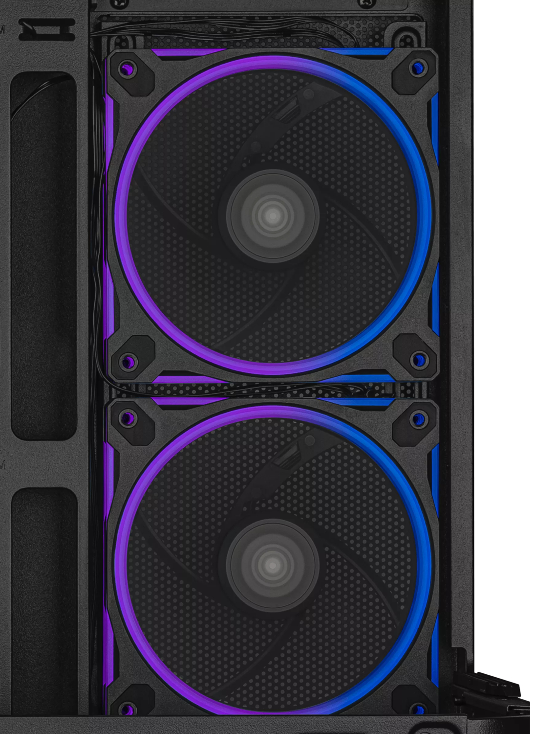 Три предустановленных 120-миллиметровых вентилятора ARGB с особо толстыми 28-миллиметровыми рамами обеспечивают оптимальный воздушный поток и оснащены 20 адресуемыми светодиодами RGB с двойной подсветкой по бокам рамы, что придает системе уникальный вид.