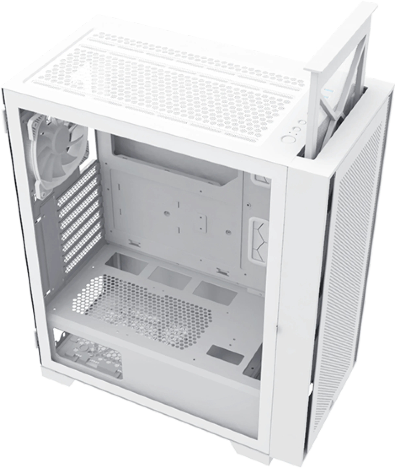 Специальная боковая панель из закаленного стекла, открывающаяся на шарнирах, облегчает пользователям доступ к внутренним компонентам. Конструкция без отверстий также улучшает структурную целостность стекла.