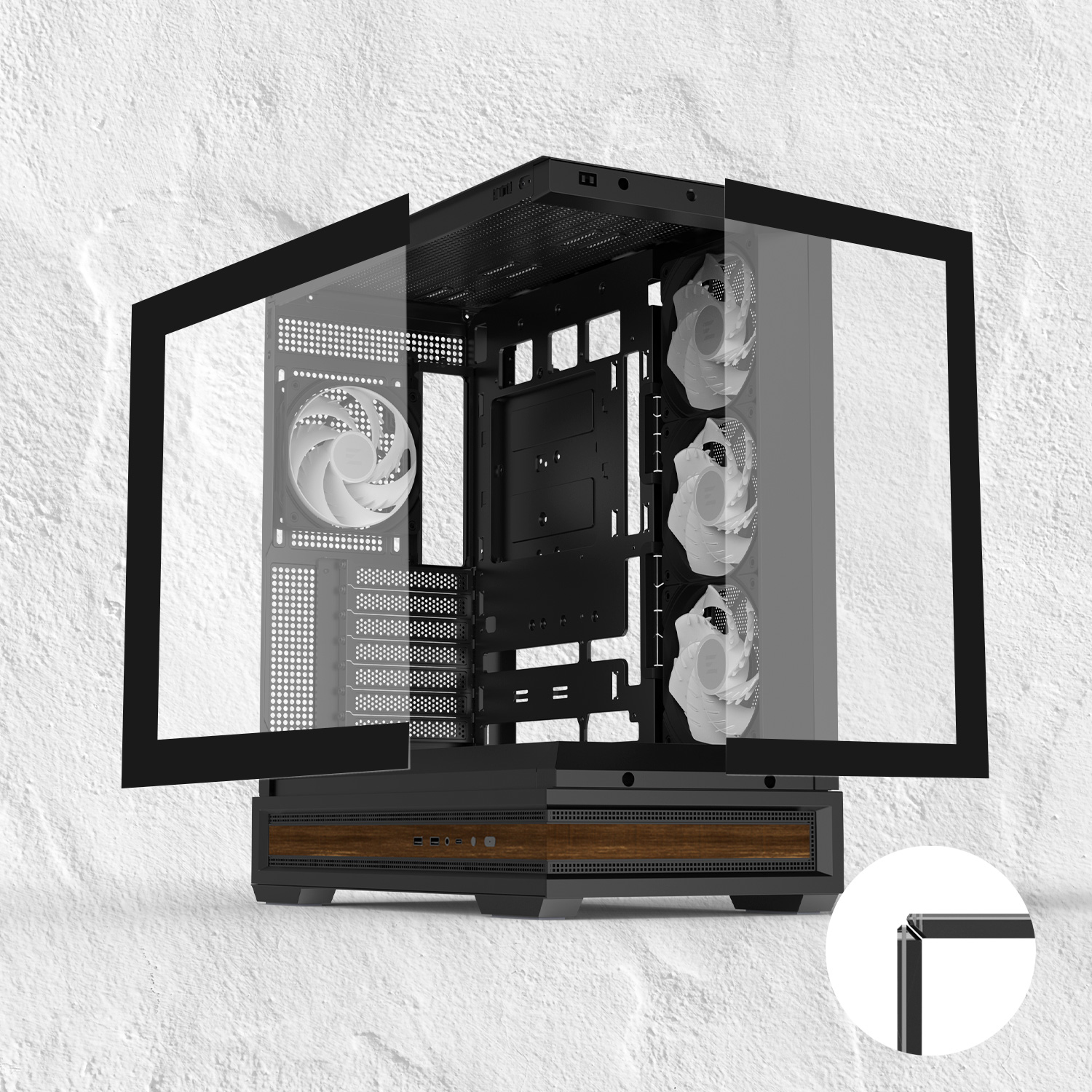 Две безрамочные панели из закаленного стекла (спереди и сбоку) демонстрируют потрясающую сборку ПК. Закаленное стекло толщиной 4 мм обеспечивает исключительную прочность.