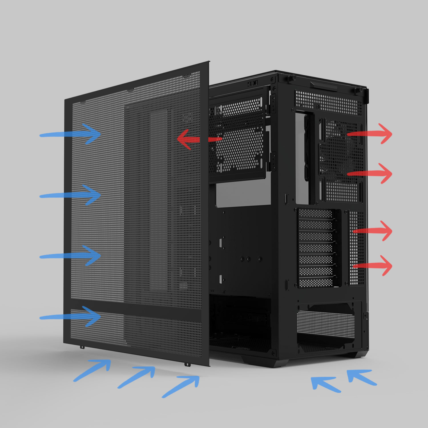 Полностью сетчатая боковая панель с вытяжным отверстием над материнской платой обеспечивает оптимальный поток воздуха.