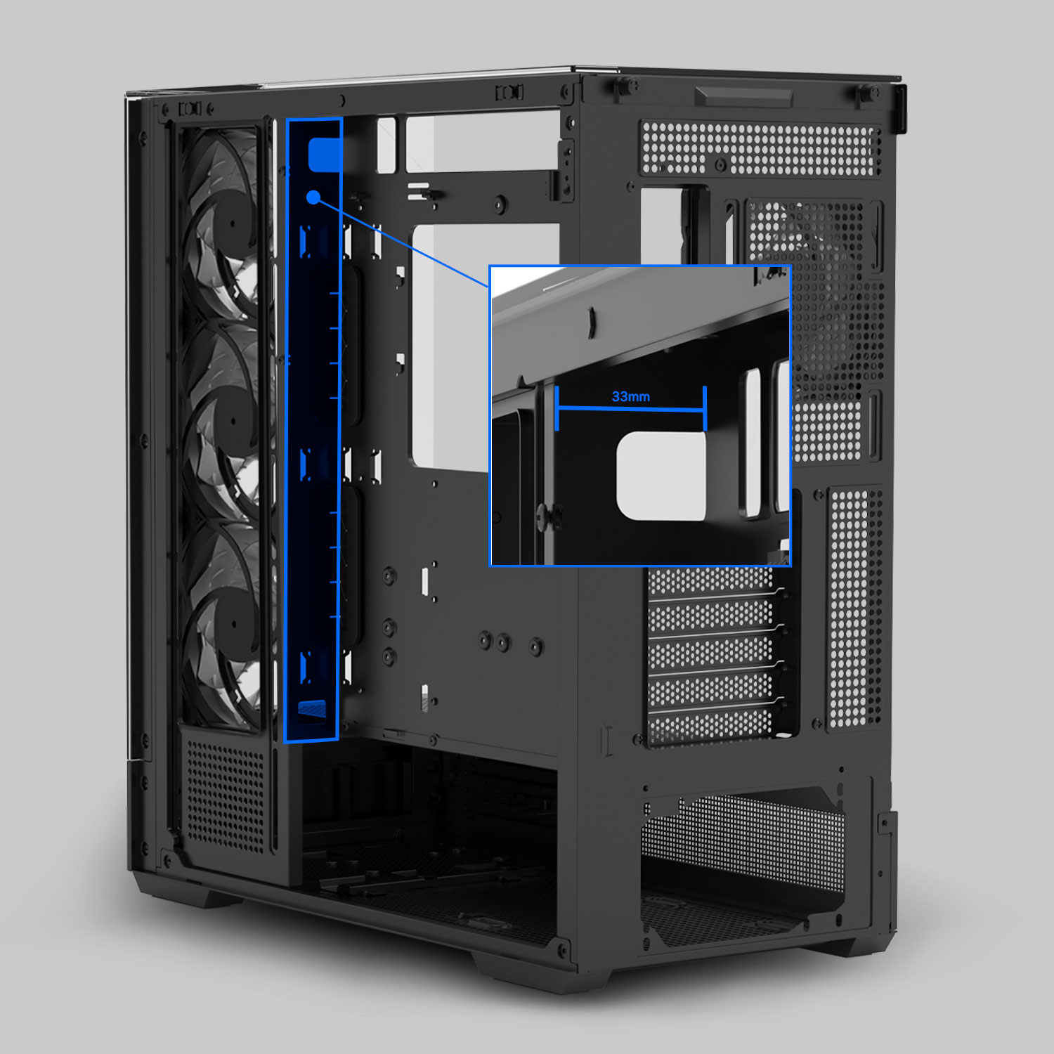33-миллиметровое пространство для кабелей помогает держать кабели в порядке. Удобное расположение и пространство для прокладки кабелей облегчают упорядочение кабелей и придают корпусу чистый вид.
