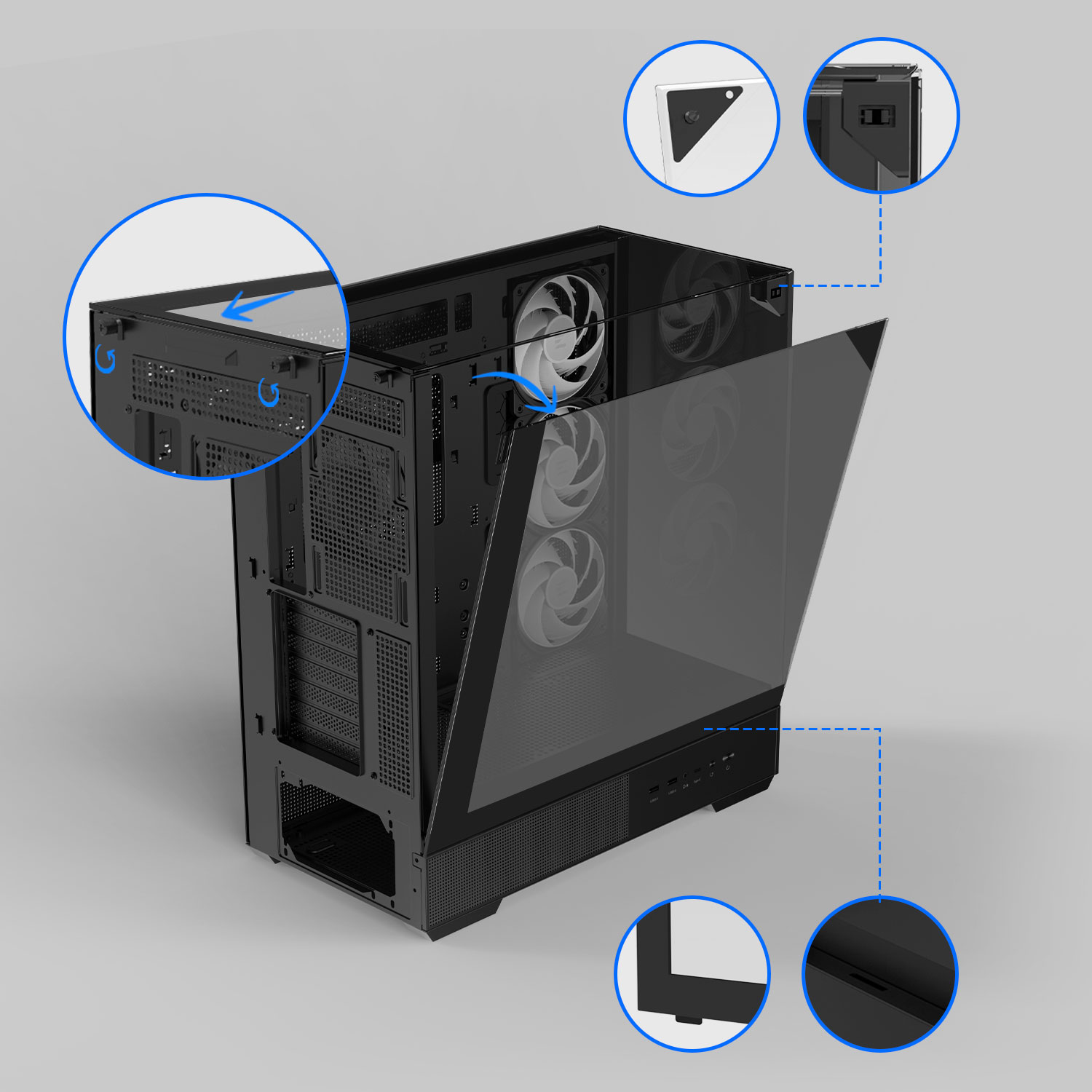 Передняя, боковая и верхняя панели легко и полностью снимаются для удобного доступа к компонентам ПК.