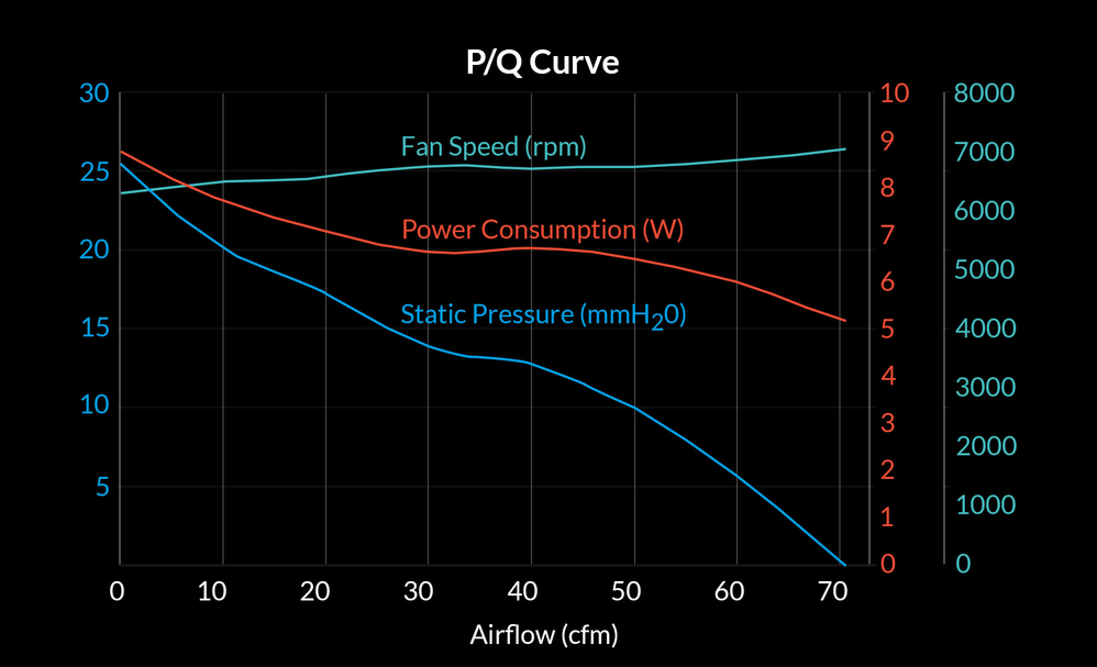 Радиаторы и теплоотводы выигрывают от использования вентиляторов с высоким статическим давлением. S8038-7K имеет статическое давление 25 мм/H2O, что позволяет ему проталкивать воздух даже через узкие охлаждающие ребра. В то же время он достигает максимального воздушного потока 118,93 м³/ч, что позволяет ему быстро отводить тепло из корпусов. Эти свойства делают его идеальным выбором для широкого спектра применений.