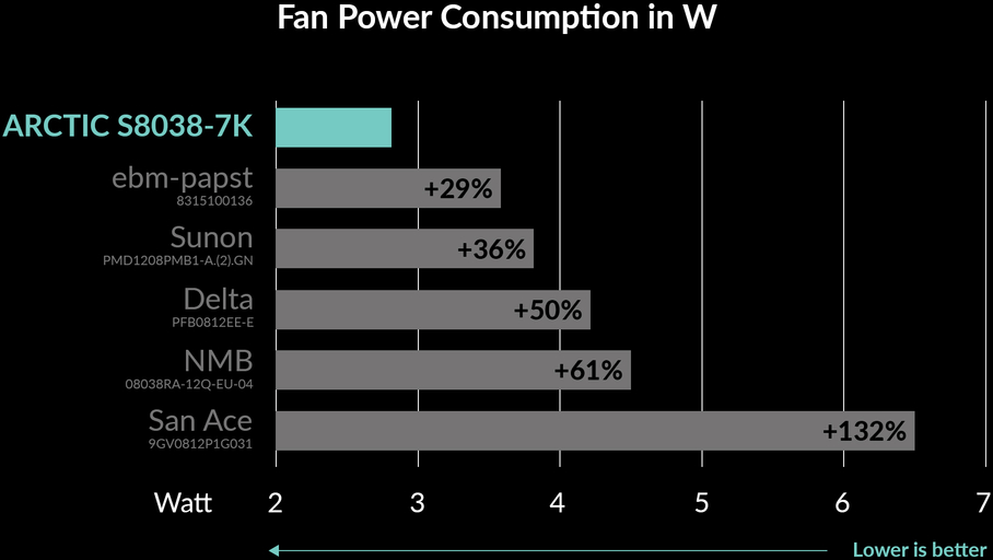 При одинаковой производительности S8038 потребляет на 25 % меньше энергии, чем ближайший конкурент, что повышает энергоэффективность вашего сервера. Снижение энергопотребления является результатом многомесячной работы инженеров ARCTIC по оптимизации двигателя с целью повышения эффективности ИТ-оборудования.