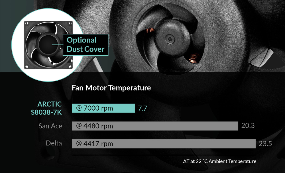 Снижение температуры двигателя на 10 °C примерно вдвое увеличивает срок его службы. Двигатель S8038-7k не только особенно эффективен, но и активно охлаждается дополнительным рабочим колесом в ступице вентилятора. В комплект поставки входит наклейка для ступицы двигателя, которая обеспечивает длительный срок службы даже в запыленных условиях.