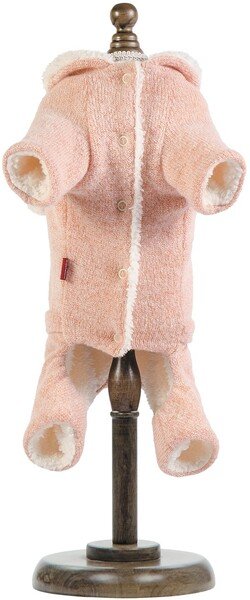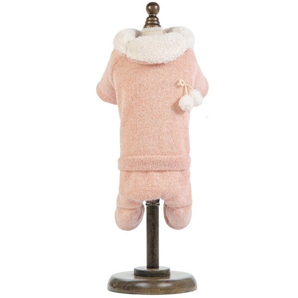 Симпатичный и очень уютный костюм сшитый из трикотажной ткани и имеет теплую пушистую подкладку. Модель персикового цвета – исключительно для «девочек», а меланжевого – имеет универсальный крой. Застежка на кнопках. Очарования костюмчику добавляют декоративные помпоны на шнурочках.