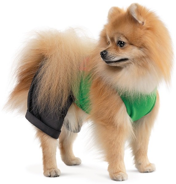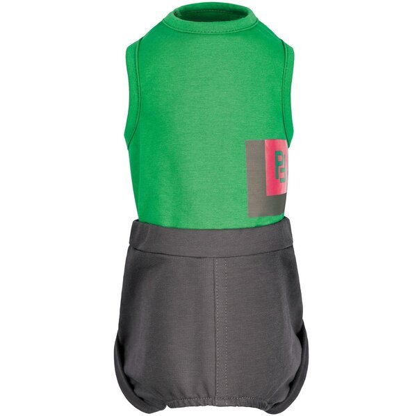 Приятный к телу костюмчик пригодится в жаркую или ветреную прохладную погоду, ведь ваш любимец заслуживает максимального комфорта на прогулке. Комбинация сочного зеленого и сдержанного серого настраивает на увлекательную неторопливую прогулку, а термоаппликация является яркой изюминкой модели. Благодаря мягкой эластичной ткани костюм легко одевается через голову.