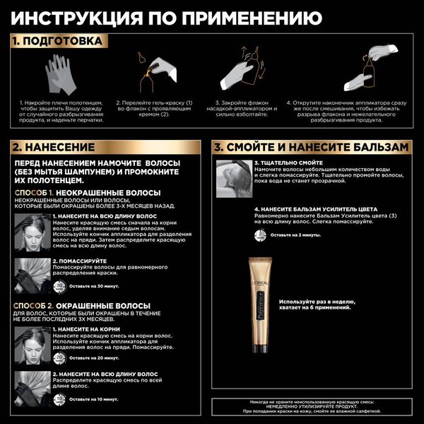 В состав упаковки входит: флакон гель-краски (60 мл), флакон-аппликатор с проявляющим кремом (60 мл), бальзам усилитель цвета (54 мл), инструкция, пара перчаток.