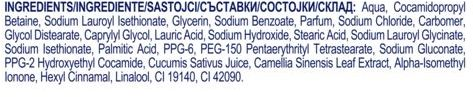 | Состав | Aqua, Cocamidopropyl Betaine, Sodium Lauroyl Isethionate, Glycerin, Sodium Benzoate, Parfum, Sodium Chloride, Carbomer, Glycol Distearate, Caprylyl Glycol, Lauric Acid, Sodium Hydroxide, Stearic Acid, Sodium Lauroyl Glycinate, Sodium Isethionate, Palmitic Acid, PPG-6, PEG-150 Pentaerythrityl Tetrastearate, Sodium Gluconate, PPG-2 Hydroxyethyl Cocamide, Cucumis Sativus Juice, Camellia Sinensis Leaf Extract, Alpha-Isomethyl Ionone, Hexyl Cinnamal, Linalool, CI 19140, CI 42090 |