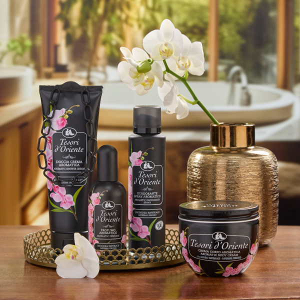 Магнетический и чувственный аромат бренда Tesori d'Oriente сопровождает во время водных процедур. Парфюмированный крем-гель для душа способствует деликатному очищению кожи, оставляет на ней нежное цветочное благоухание, дарит мгновенное ощущение гармонии. Аромат принадлежит к группе восточных цветочных. В начале представлены цитрусовые аккорды сочного мандарина и спелого апельсина в окружении зеленых оттенков листьев смородины. В сердце - душистый букет из изумительной орхидеи, нежного цветка тиаре, утонченного апельсинового цвета, элегантного жасмина. Завершается композиция контрастным звучанием мягкости мускуса, древесными полутонами сандала, сладкими вкраплениями ванили и пралине, сияющей миррой. Крем-гель представлен в формате тюбы, имеет декорацию в виде цепочки для комфортного подвешивания на полках или в любом другом месте.