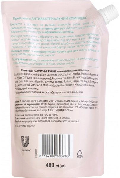 Бренд Бархатные Ручки представляет крем-мыло для рук Антибактериальный комплекс, с которым мытье рук превратится в косметическую процедуру по уходу. Новая формула крем-мыла обеспечивает натуральную антибактериальную защиту и бережный уход во время мытья рук. Крем-мыло содержит крем Бархатные Ручки, за счет чего обеспечивает нежное очищение и питание кожи во время мытья рук. Не содержит красителей. Соответствует естественному уровню pH кожи. Жидкое крем-мыло для рук Бархатные Ручки Антибактериальный комплекс обеспечивает ультранежное очищение и не сушит кожу, подготавливая ее к дальнейшему уходу.