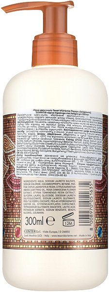 | Состав | Aqua, Sodium Laureth Sulfate, Sodium Chloride, Cocamidopropyl Betaine, Par Fum, Cistus Ladaniferus Resin, Citrus Aurantium Amara Leaf/Twig Oil, Rosa Damascena Flower Extract, Styrax Tonkinensis Resin Extract, Glycerin, Lauryl Glucoside, Disodium Laureth Sulfosuccinate, Sodium Lauroyl Glutamate, Peg-7 Glyceryl Cocoate, Peg-40 Hydrogenated Castor Oil, Styrene/Acrylates Copolymer, Tetrasodium Glutamate Diacetate, Lactic Acid, Potassium Sorbate, Sodium Benzoate, Benzyl Alcohol, Coumarin |