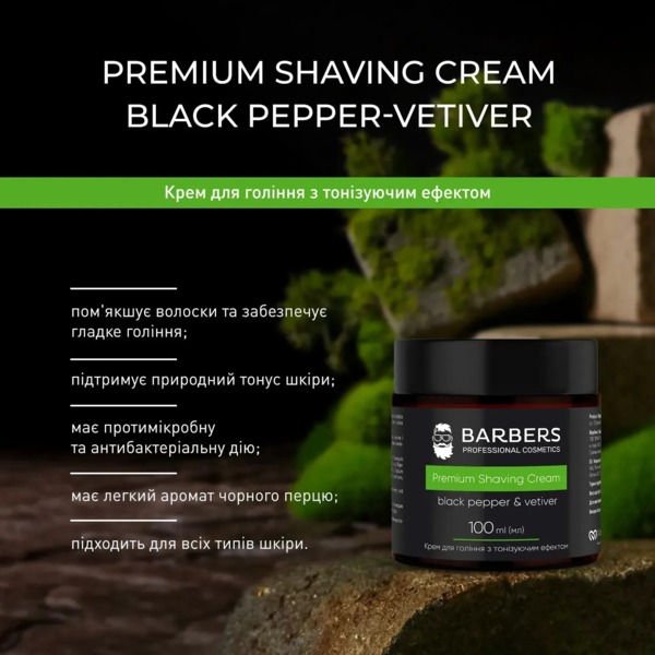 - Крем для бритья с тонизирующим эффектом Barbers Black Pepper-Vetiver 100 мл