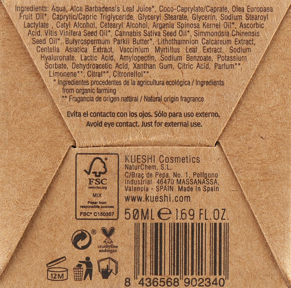 | Состав | Aqua, Aloe Barbadensis Leaf Juice, Coco-Caprylate/Caprate, Olea Europaea Fruit Oil, Caprylic/Capric Triglyceride, Glyceryl Stearate, Glycerin, Sodium Stearoyl Lactylate, Cetyl Alcohol, Cetearyl Alcohol, Argania Spinosa Kernel Oil, Ascorbic Acid, Vitis Vinifera Seed Oil, Cannabis Sativa Seed Oil, Simmondsia Chinensis Seed Oil, Butyrospermum Parkii Butter, Lithothamnion Calcareum Extract, Centella Asiatica Extract, Vaccinium Myrtillus Leaf Extract, Sodium Hyaluronate, Lactic Acid, Amylopectin, So |