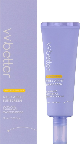 Крем, не оставляющий белых следов и ощущения липкости, надежно защищает кожу от ультрафиолетовых лучей. Благодаря своей легкой консистенции vvbetter Daily Airfit Sunscreen SPF 50+ PA++++ легко распределяется и мгновенно впитывается. Крем не оставляет жирных следов и липкой пленки. Идеально подходит для ежедневного использования. Крем не только защищает кожу от УФ-лучей, но и придает блеск и сияние, а также обладает антивозрастными свойствами. Факторы SPF 50+ PA++++ обеспечивают надежную защиту поверхностных и глубоких слоев эпидермиса. Крем содержит комплекс регенерирующих компонентов, таких как сквален, пантенол и мадекасозид.