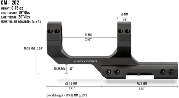 Моноблок Vortex Cantilever Mount 30mm 2" Offset Rings (CM-202) предназначен для установки оптических прицелов на оружие с платформу AR-15 с плоским верхом. Крепление изготовлено из прочного алюминиевого сплава. Моноблок устанавливается на планку Пикаттини/Вивераи, смещение колец 2".