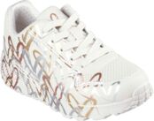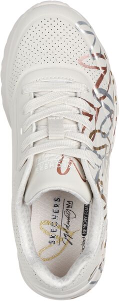 Продемонстрируйте свой креативный стиль, надев Skechers Uno Lite. Эти модные кроссовки на шнурках украшены металлическим принтом с фирменным граффити-сердцем художника, которое простирается до подошвы, синтетическим верхом из дурабака и перфорированной отделкой, стелькой Skechers Air-Cooled Memory Foam и платформой - клином.